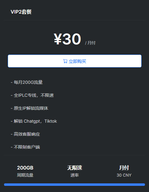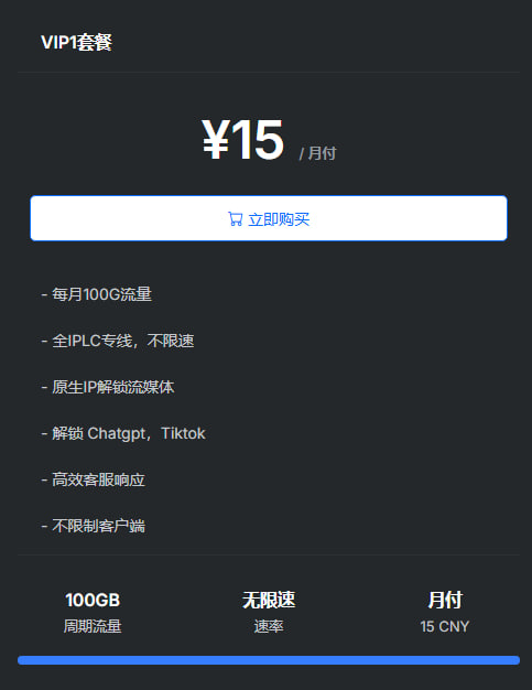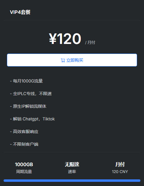 Totoro Cloud 中文名为龙猫云,一家颇具实力的新机场,Shadowsocks 协议节点,IPLC 专线,对 Netflix、Disney+ 流媒体和 ChatGPT 提供很好的解锁支持。龙猫云机场官方提供了详细的视频、文档以及贴心的客服支持,对翻墙新手十分友好。 1:85折活动优惠码:to85 适用于年付以下套餐(月付、季度、半年) 2:8折活动优惠码:to80 适用于年付及年付以上套餐(年、2年、3年) 官网入口 下面是龙猫云VIP套餐介绍:###套餐不同时间会所波动,所有套餐以官方为准### 本次截取为龙猫云10月份的套餐价格,龙猫云 680DIY 定制套餐,直接私聊客服!!!!